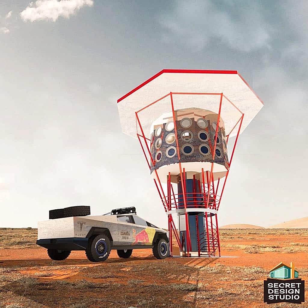 Tesla Electric Vehicle very remote off-grid recharge station tiny house concept by Secret Design Studio. (24 sq.m floor area) Tesla Electric Vehicle very remote off-grid recharge station tiny house concept by Secret Design Studio. (24 sq.m floor area)